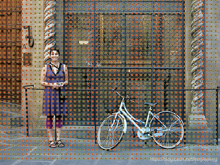 特征图上的每个点生成一个Anchors,Anchors 可以理解成9个不同的框(框的属性是长宽,再进一步是四个点的坐标)。这个框的数据(框的左上角坐标(x0,y0),右下角坐标(x1,y1))这四个值都是对应于原图的。下面这个就是原图,红色点就是特征图上的点对应于原图的位置。每一个位置使用 9 个锚点,每个位置会生成 2×9 个目标分数和 4×9 个坐标分数。显然,通过一个中心定义9个不同的框,就是为实现多尺度这个想法。当然这样做获得检测框很不准确,后面会做2次 bounding box regression 修正检测框位置。