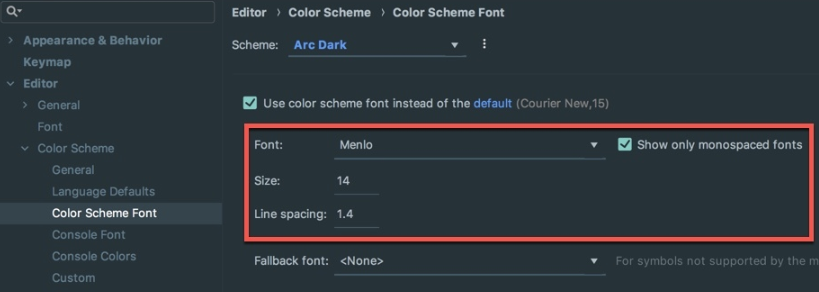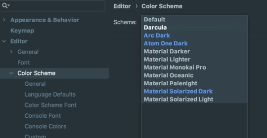 切换主题Editor -> Color Scheme,安装完这里会出现一些主题选项,可以选择自己喜欢的主题;