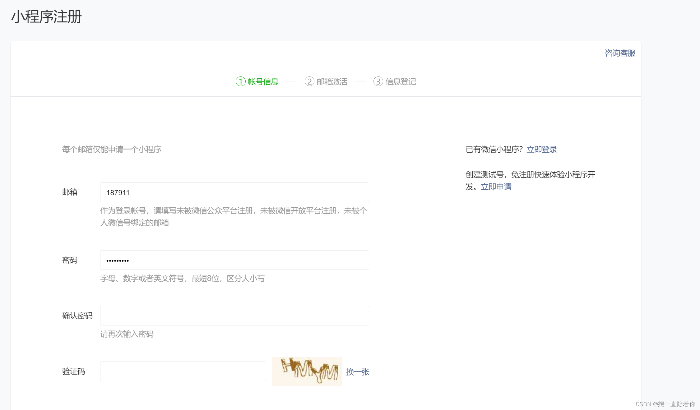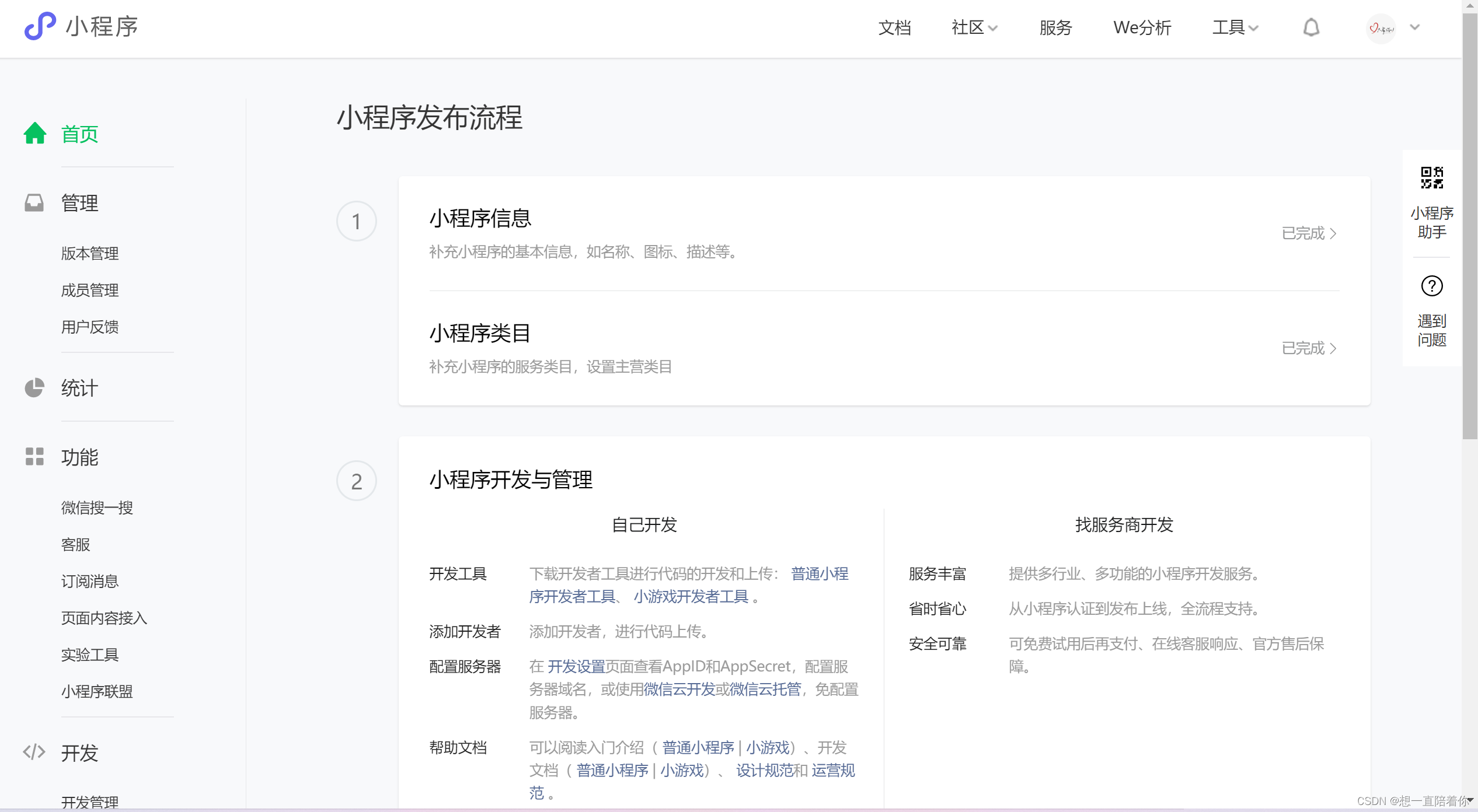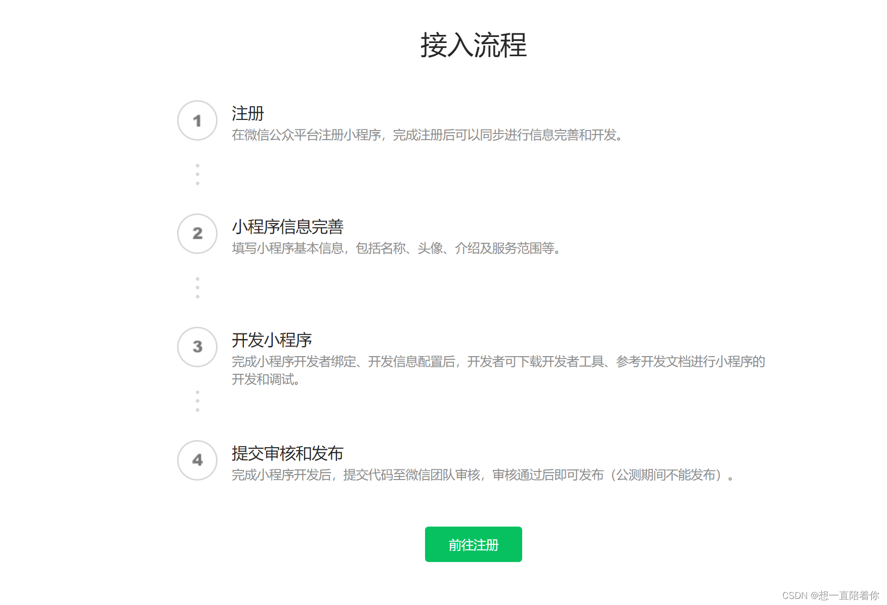 1、浏览器搜索: 微信公众平台 2、点击小程序 3、滑至底部,前往注册 4、按照注册流程依次填写信息 5、注册好后,来到微信公众平台,用微信扫码登录小程序 6、完成小程序信息的填写 7、找到开发者工具 8、前往下载开发工具 选择稳定版,下载,安装 9、打开微信开发工具,扫码登陆 10、点击“+”按钮 以上就是注册一个微信小程序的全部流程,后续将继续更新如何开发小程序。