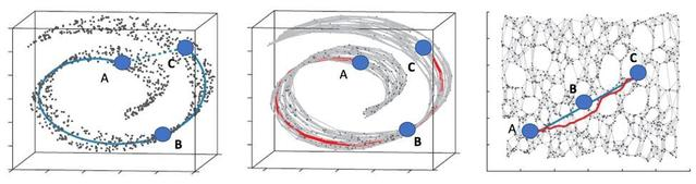 试想如果有一张纸,纸上有三个点,A、B和C,AB比AC在纸面上更近。但如果把纸弯成图8的形状,再按直线距离来算时,AC就会更近。但按流形的定义,AC这条路径是不能出现的,因为这个纸就是一个空间,是一个不能为二维蚂蚁逃脱的空间。因此,更合理的计算方式是把图8右图的红色曲线长度,即测地线精确算出来。