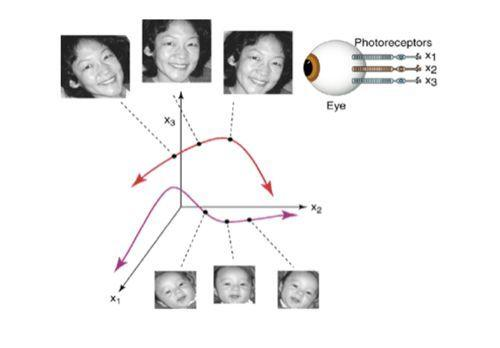 2000年的时候,普林斯顿大学教授Sebastian Seung 和宾州大学教授Daniel Lee 在《Science》上发了篇论文。他们认为人是以流形方式来记忆的。以视觉感知为例,假定人的视网膜只有三个视神经元,不考虑颜色的变化, 每个神经元能感受一定的光强变化,那么看到一个母亲的人脸后,视神经元上会有三个响应。