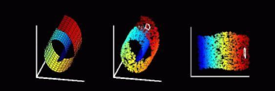 但是,数据形成的流形结构并非只有曲线一种情况,它可能会有如图7所示的瑞士卷的复杂结构。他可能还不止一个,比如两个卷在一起的双螺旋线。那么,要想利用经典又好使的欧氏距离来解决问题,可行的方案之一就是把它们摊平或拉平,这样,我们待分析的数据所处的空间就是欧氏空间了。于是,有大量的流形学习的工作便在此基础上展开了。