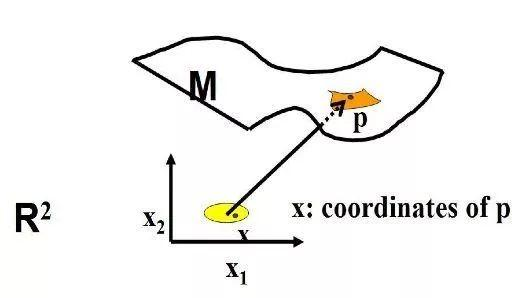 图1 局部欧氏与黎曼流形:二维流形或曲面M上的一个局部p (橙色区域)与欧氏空间中的黄色区域等价。