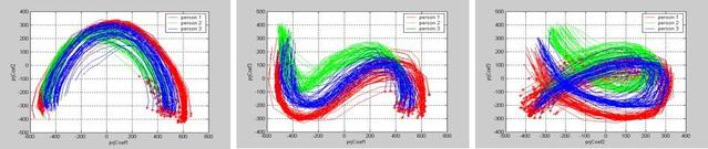 为什么计算机没有人脑的旋转不变性呢?图6显示了一组人脸在摄像机前仅进行平移而保持其它性质不变的图像集。如果把每个像素视为一个维度,则每张照片可视为高维空间的点,则多次采集的多个人的照片集合看成是该空间的点云。通过某些简单的统计策略总结出前三个主要的维数,再将点云投影到这个三维空间并两两描绘出来,便有了图6的曲线图。