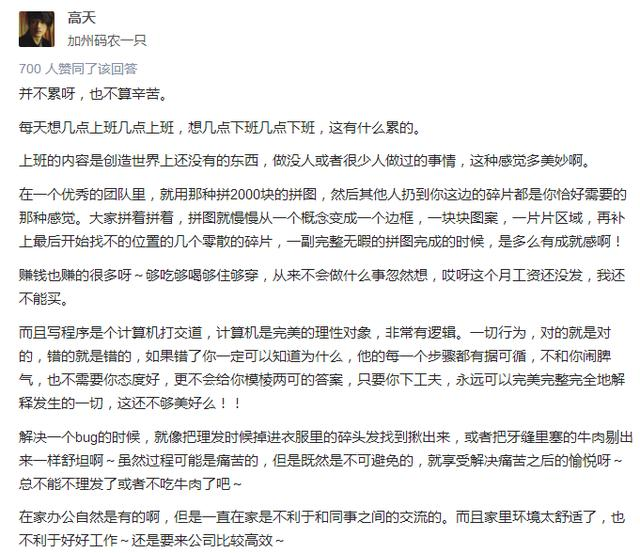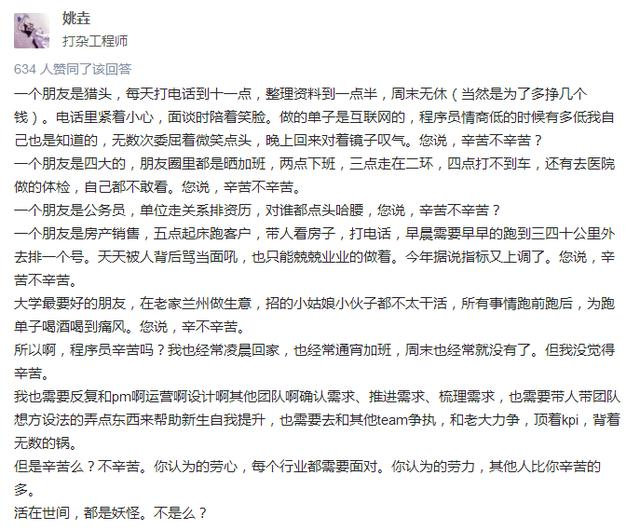 阅历越增加越知道各行各业都有自己的辛苦,辛苦并不等于累。程序员普遍会有加班现象,其他行业也不轻松啊,做销售的要陪客户跑上跑下嘴皮说干,做生意的有时候喝酒喝得痛风,做广告的想创意也经常改版,做公务员的要搞好上下关系等等。成年人的社会了,都还是蛮辛苦的,说不辛苦的可能是家里有矿吧。