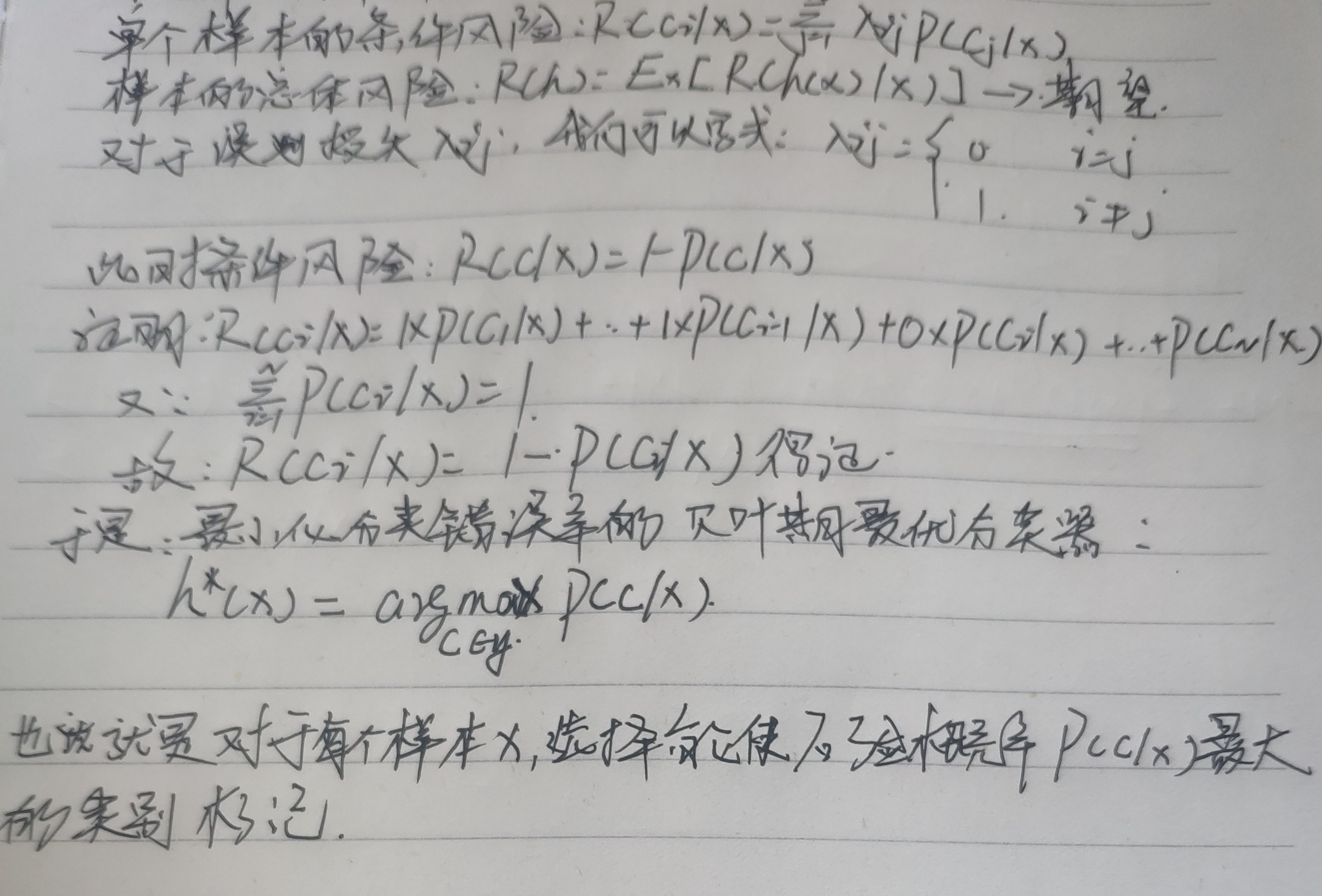 上面的“条件风险”。(在这里的后验概率可以这样理解:在已知西瓜颜色,根蒂等的情况下,将此西瓜分类为