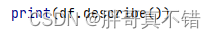 通过Pandas工具的describe()方法来查看数据的平均值、标准差、最小值、分位数、最大值。
