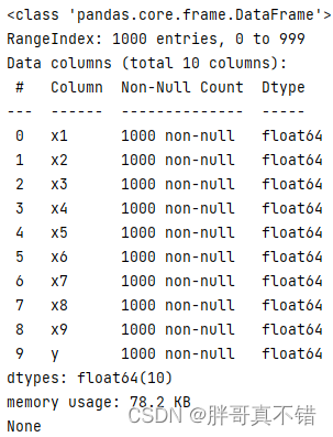 从上图可以看到,总共有10个变量,数据中无缺失值,共1000条数据。