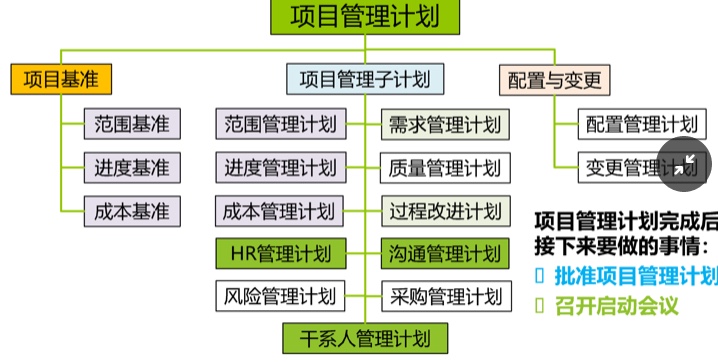 拿着老板的签字后,找人去汇总计划。首选拿着项目章程给大伙儿看,毕竟如果有人不认可咱是项目经理可不行哦,大家都知道我的头后,自然就会听我指挥了。然后让大家来做成一个个子计划,完成后对各个子计划进行整合和裁剪,项目管理计划就出来了。这个计划中包括了三个基准和13个计划文件,这个计划非常重要,干活儿也好监督也好,都会使用到这个计划,而且这个计划不是做完就完事儿的,它需要边做边调整和维护,做到渐进明细和逐步精确。