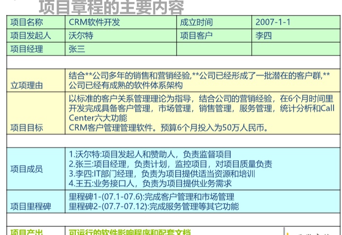 就是找老板签字立项。为了能让老板签字认可项目,需要用到工作说明书来说明项目大概是做什么,再找专家说我看行所以要用商业论证,再不行就给老板看看协议,客户都给钱了,老板你能不承认咱们项目吗。就这样老板签字文件后,就成了项目章程。