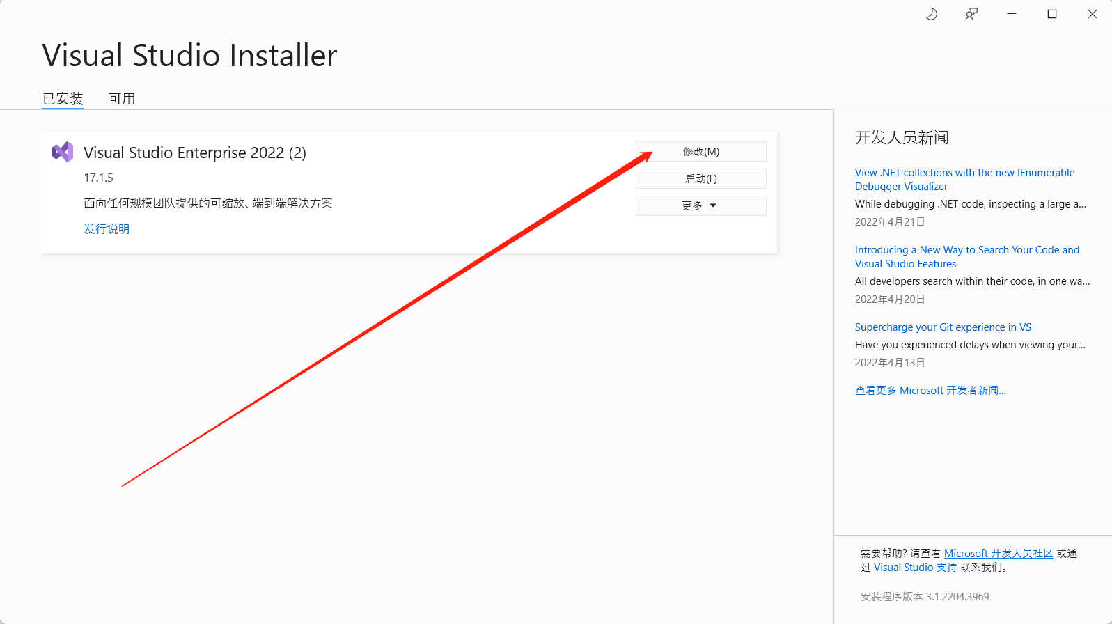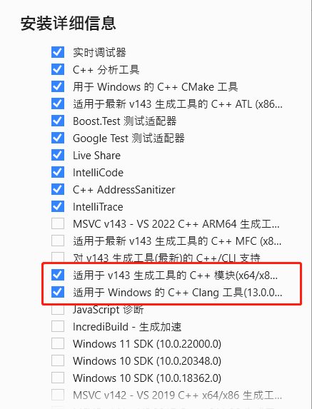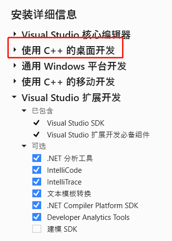你们不需要向我一样安装这么多,只需要有这个C++桌面开发,然后点击小箭头打开详情