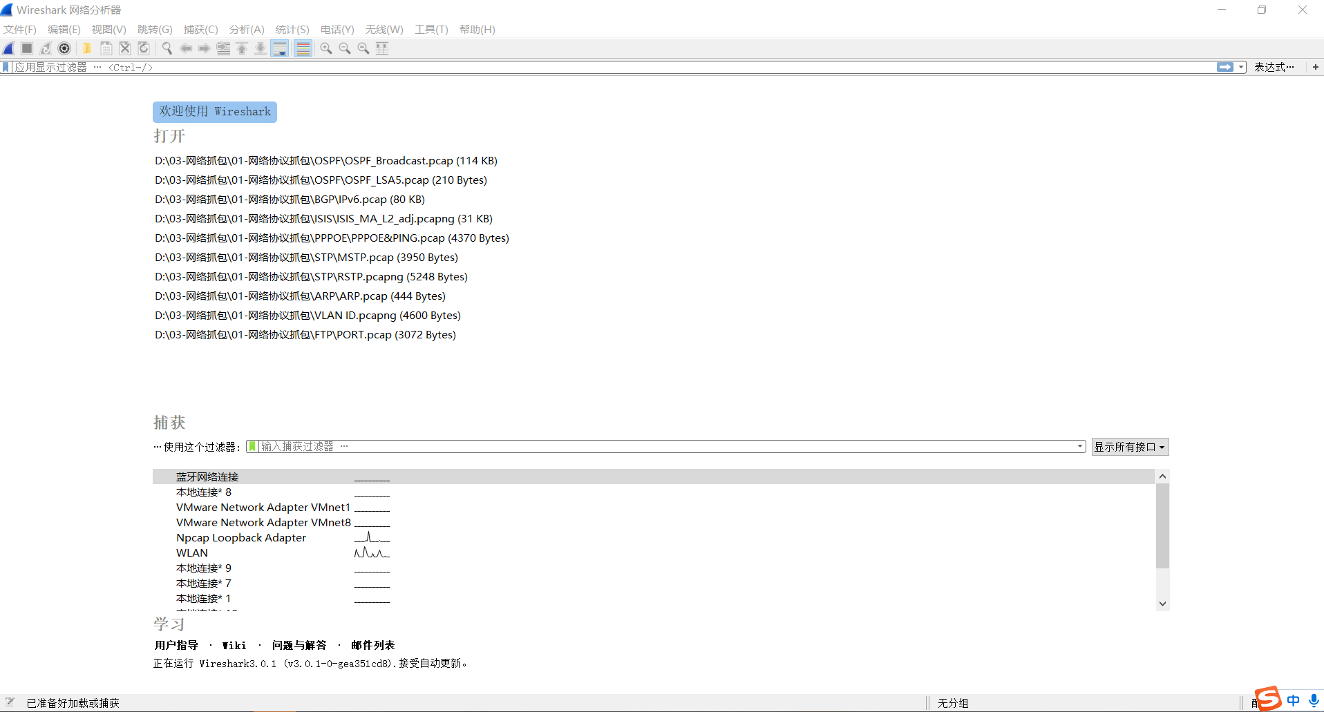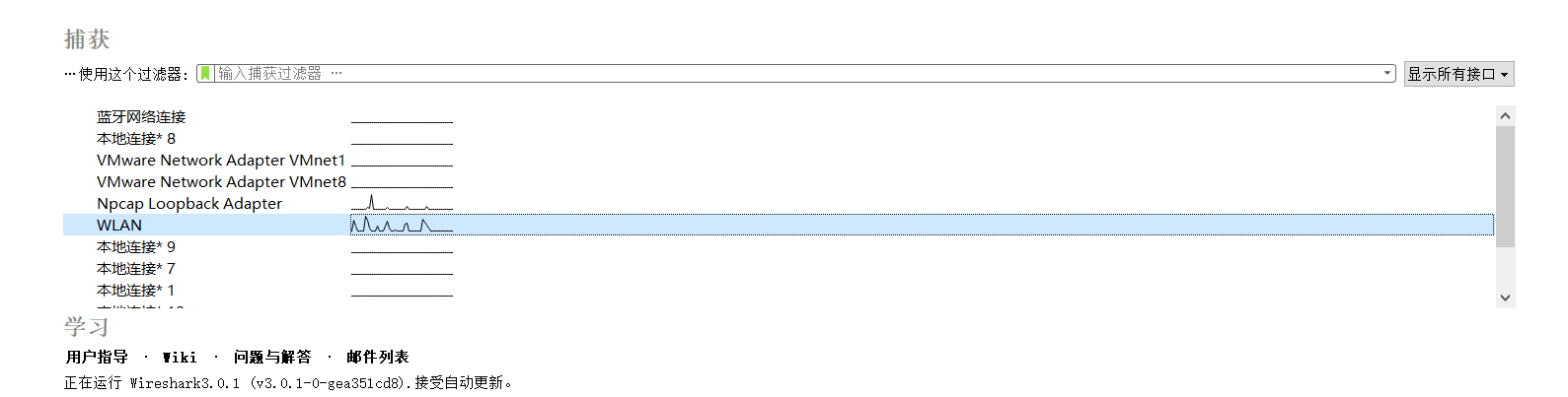 1、打开wireshark 3.0.1,主页面如下: