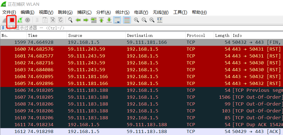 5、抓包完成后可以点击暂停按钮,停止捕获: