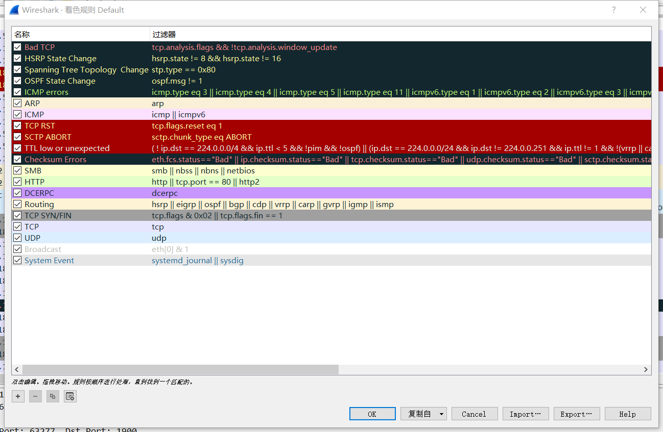说明:数据包列表区中不同的协议使用了不同的颜色区分。协议颜色标识定位在菜单栏View(视图) --> Coloring Rules(着色规则)。如下所示