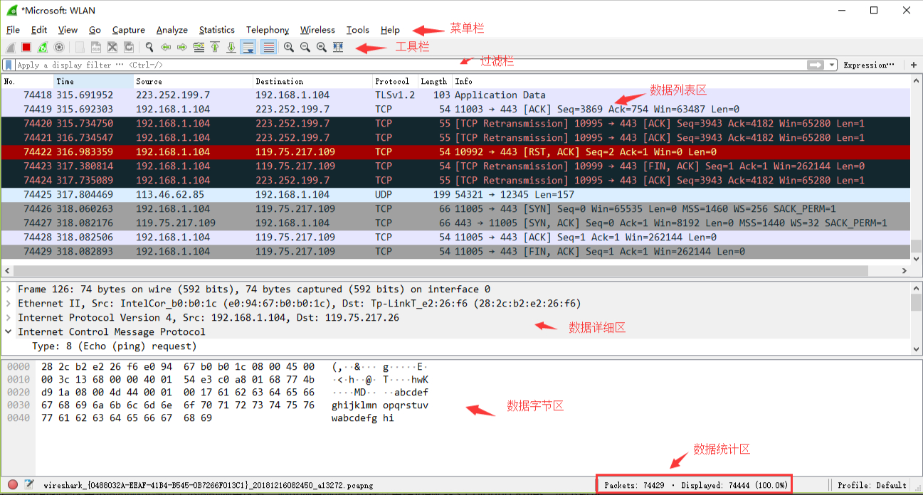三、wireshark抓包界面介绍: