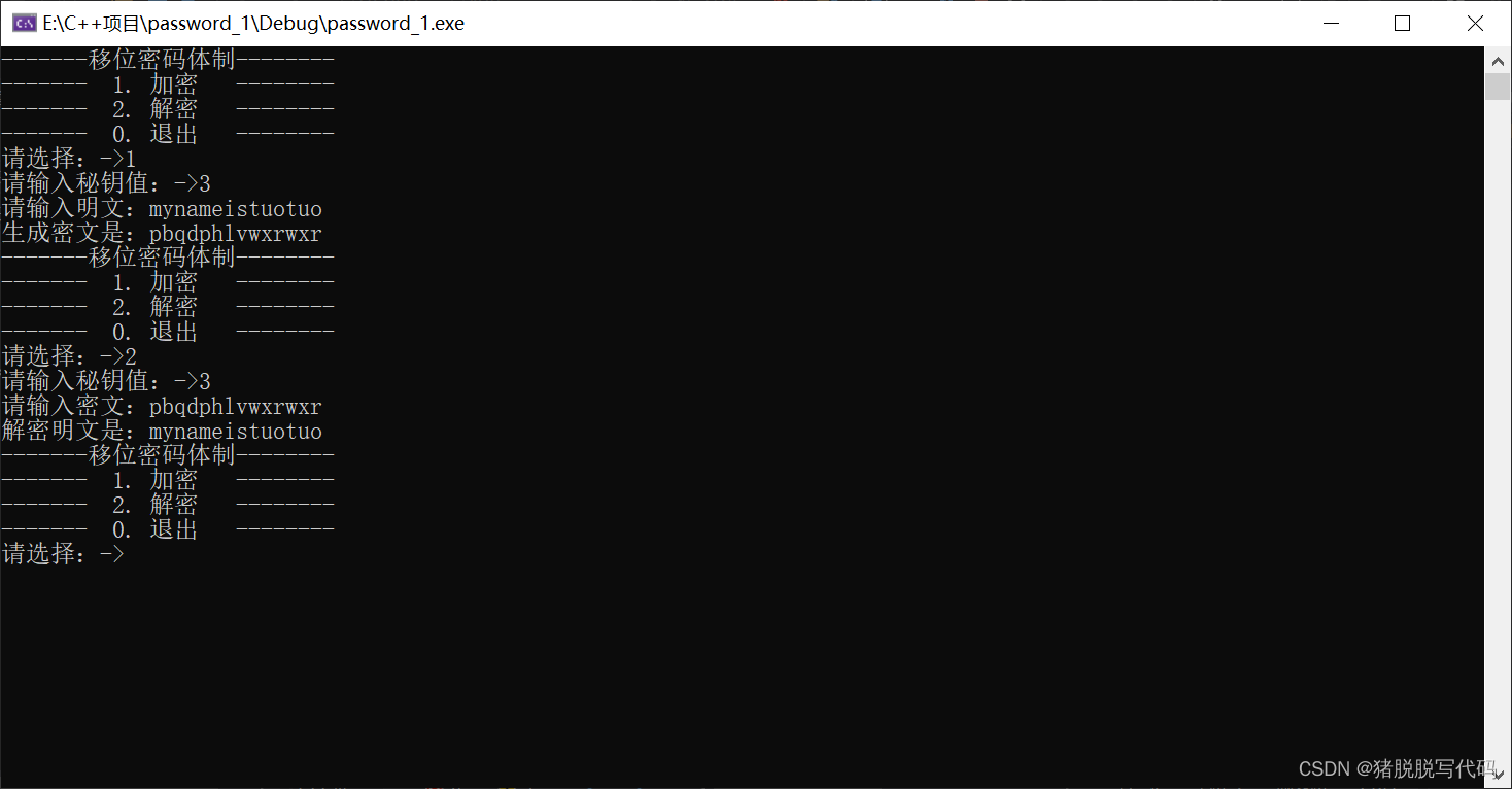 #include<stdio.h>void menu() {printf("-------移位密码体制--------\n");printf("------- 1. 加密 --------\n");printf("------- 2. 解密 --------\n");printf("------- 0. 退出 --------\n");