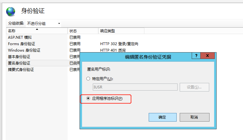 打开iis站点身份验证>>匿名身份验证>>选择应用程序池标识>>确定