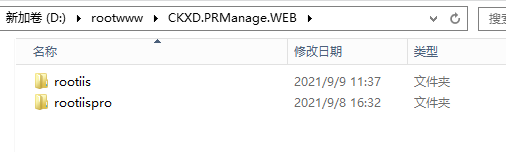 新增本地存放网站部署包的目录rootwww,并在这个目录下新增rootiis和rootiispro(其中rootiis是iis站点指向目录;rootiispro是用来存放一些不需要经常更新,并且有可能做变更操作的文件夹,rootiispro中文件夹通过iis虚拟目录的方式进行添加到iis站点下)