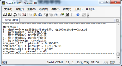 /* ********************************************************************************************************* * 函 数 名: DSP_Mean * 功能说明: 求平均 * 形 参: 无 * 返 回 值: 无 ********************************************************************************************************* */ static void DSP_Mean(void) {float32_t pSrc[10] = {0.6948f, 0.3171f, 0.9502f, 0.0344f, 0.4387f, 0.3816f, 0.7655f, 0.7952f, 0.1869f,0.4898f};float32_t pResult;uint32_t pIndex;q31_t pSrc1[10];q31_t pResult1;q15_t pSrc2[10];q15_t pResult2;q7_t pSrc3[10];q7_t pResult3;arm_mean_f32(pSrc, 10, &pResult);printf("arm_mean_f32 : pResult = %f\r\n", pResult);/*****************************************************************/for(pIndex = 0; pIndex < 10; pIndex++){pSrc1[pIndex] = rand();}arm_mean_q31(pSrc1, 10, &pResult1);printf("arm_mean_q31 : pResult = %d\r\n", pResult1);/*****************************************************************/for(pIndex = 0; pIndex < 10; pIndex++){pSrc2[pIndex] = rand()%32768;}arm_mean_q15(pSrc2, 10, &pResult2);printf("arm_mean_q15 : pResult = %d\r\n", pResult2);/*****************************************************************/for(pIndex = 0; pIndex < 10; pIndex++){pSrc3[pIndex] = rand()%128;}arm_mean_q7(pSrc3, 10, &pResult3);printf("arm_mean_q7 : pResult = %d\r\n", pResult3);printf("******************************************************************\r\n"); }