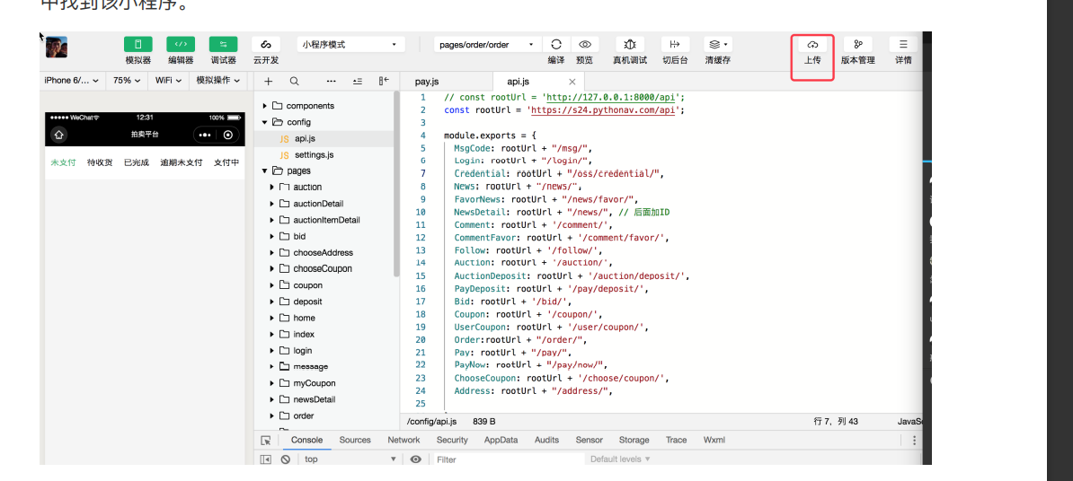 1. 配置服务器域名 小程序要求程序中使用到所有外部链接(HTTPS)必须将域名提前配置到微信平台。 2. 小程序api路径替换 3. 上传小程序代码 如果想让小程序被所有人在微信中使用,需要将小程序代码进行上传&审核,审核通过之后才能在微信中找到该小程序。 4. 需要对小程序进行描述和配置: 5. 提交审核(1-2天)︰