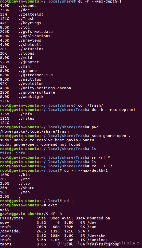 可以看到,最大的文件其实在 ~/.local/share/Trash 下,而这个正是LInux下的垃圾箱(可以理解为windows回收站)