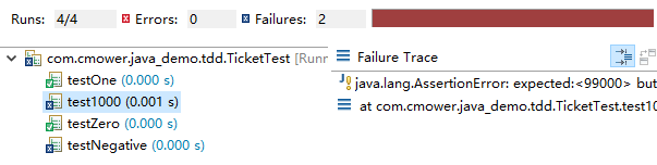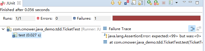 测试用例运行结果如下图所示,红色表示测试没有通过:预期结果是 99,实际结果是 0。