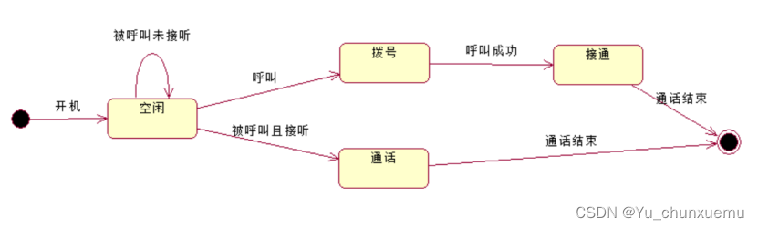 3.对用户使用手机拨打电话的过程建立状态模型。手机开机时,处于空闲状态,当用户开始使用电话呼叫某人时,手机进入拨号状态。如果呼叫成功,即电话接通,手机就处于通话状态;如果呼叫不成功,如对方线路问题、关机、拒接等,这时手机停止呼叫,重新进入空闲状态。手机在空闲状态被呼叫。如果用户接听电话,用户处于通话状态;如果用户未做出任何反应,可能他没有听见铃声,手机一直处于空闲状态。