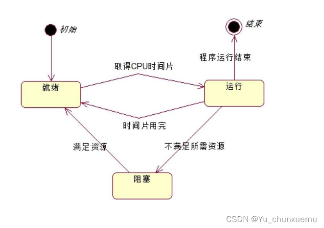 2.绘制进程状态图。操作系统-进程,就绪 运行 阻塞三个状态,初态就绪; 程序运行结束后终态,就绪态获得CPU时间片转为运行态;运行态时间片用完转为就绪态;运行态不满足所需资源转为阻塞态,阻塞态若资源满足则回到就绪态