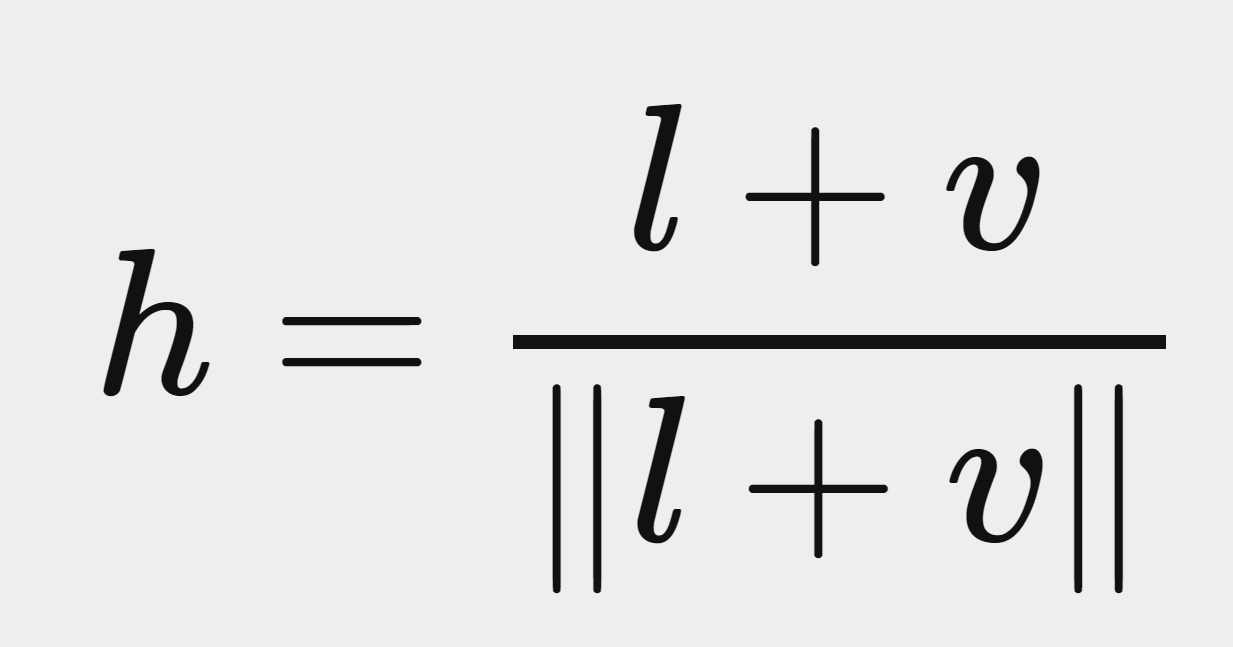 没有任何表面在微观层面上是完全光滑的,但由于这些微表面足够小,我们无法在每个像素的基础上区分它们,但我们在统计上近似表面的微表面粗糙度,给定粗糙度范围。基于表面的粗糙度,我们可以计算出与某个向量大致对齐的微表面的比率 h。这个向量 h 是个半程向量(Halfway Vector),即光线与视线夹角一半方向上的一个单位向量: