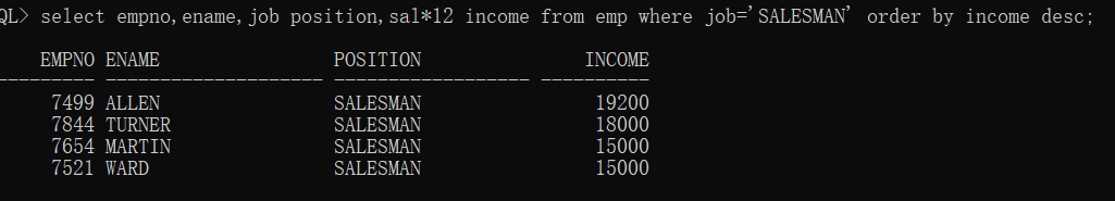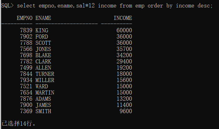 select empno,ename,sal*12 income from emp order by income desc;