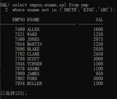 where ename not in (’SMITH’,’KING’,’ABC’) ;