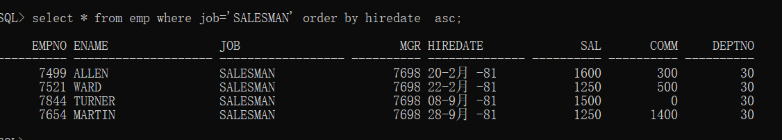 select * from emp where job=’SALESMAN’ order by hiredate asc;