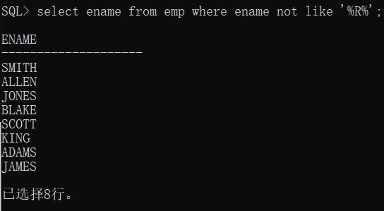 select ename from emp where ename not like ‘%R%’;