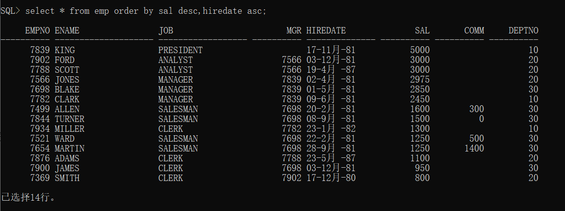 order by sal desc,hiredate,job;