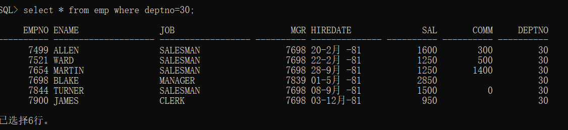 #查询部门30中的所有员工