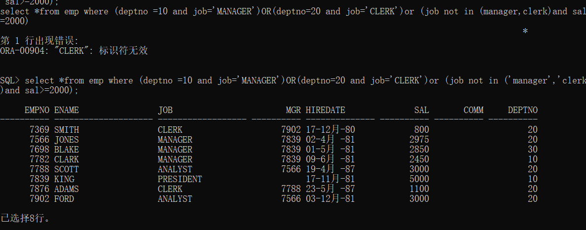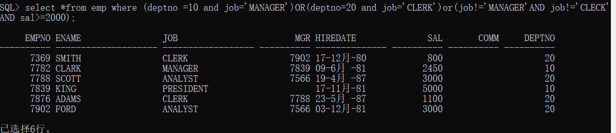 select * from emp where (deptno=10and job=’MANAGER’)OR(deptno=20 and job=’CLERK’)OR(job not in(‘manager’,’clerk’)and sal>=2000);
