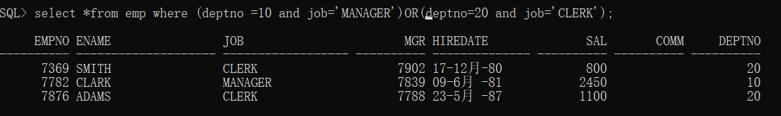 select* from emp where (deptno=10and job=’MANAGER’) OR(deptno=20 and job=’CLERK’);