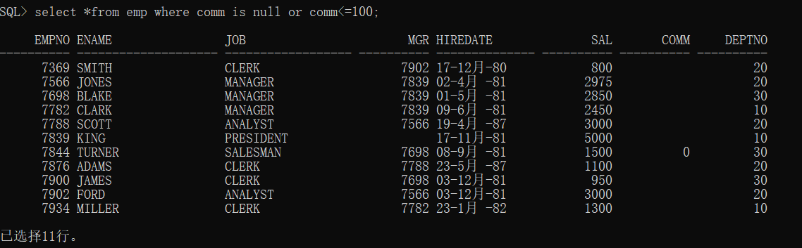 select * from emp where comm is null or comm<=100;