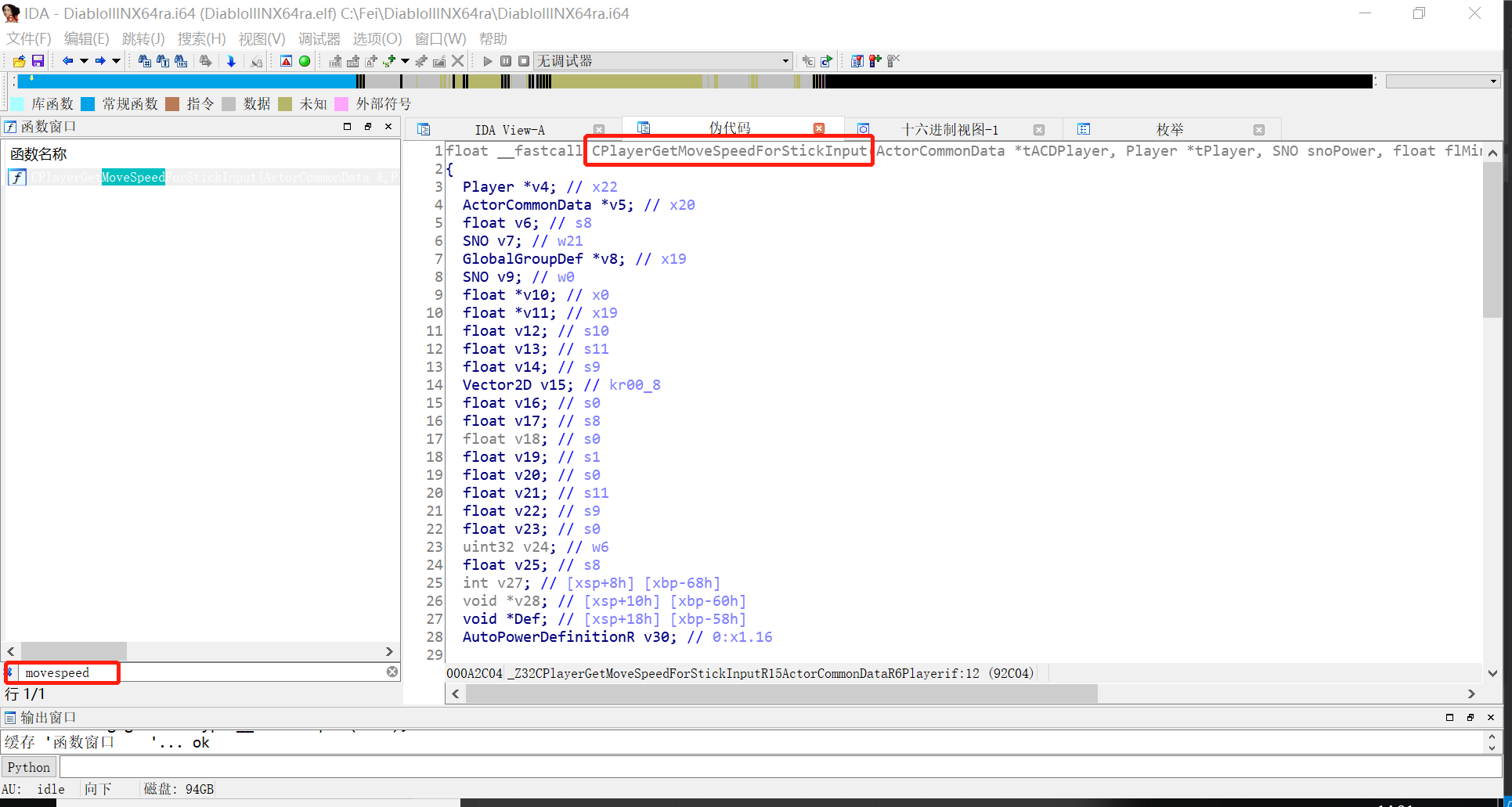 1. 我们在原始版本里搜索移速英文movespeed得到一个结果,双击打开伪代码
