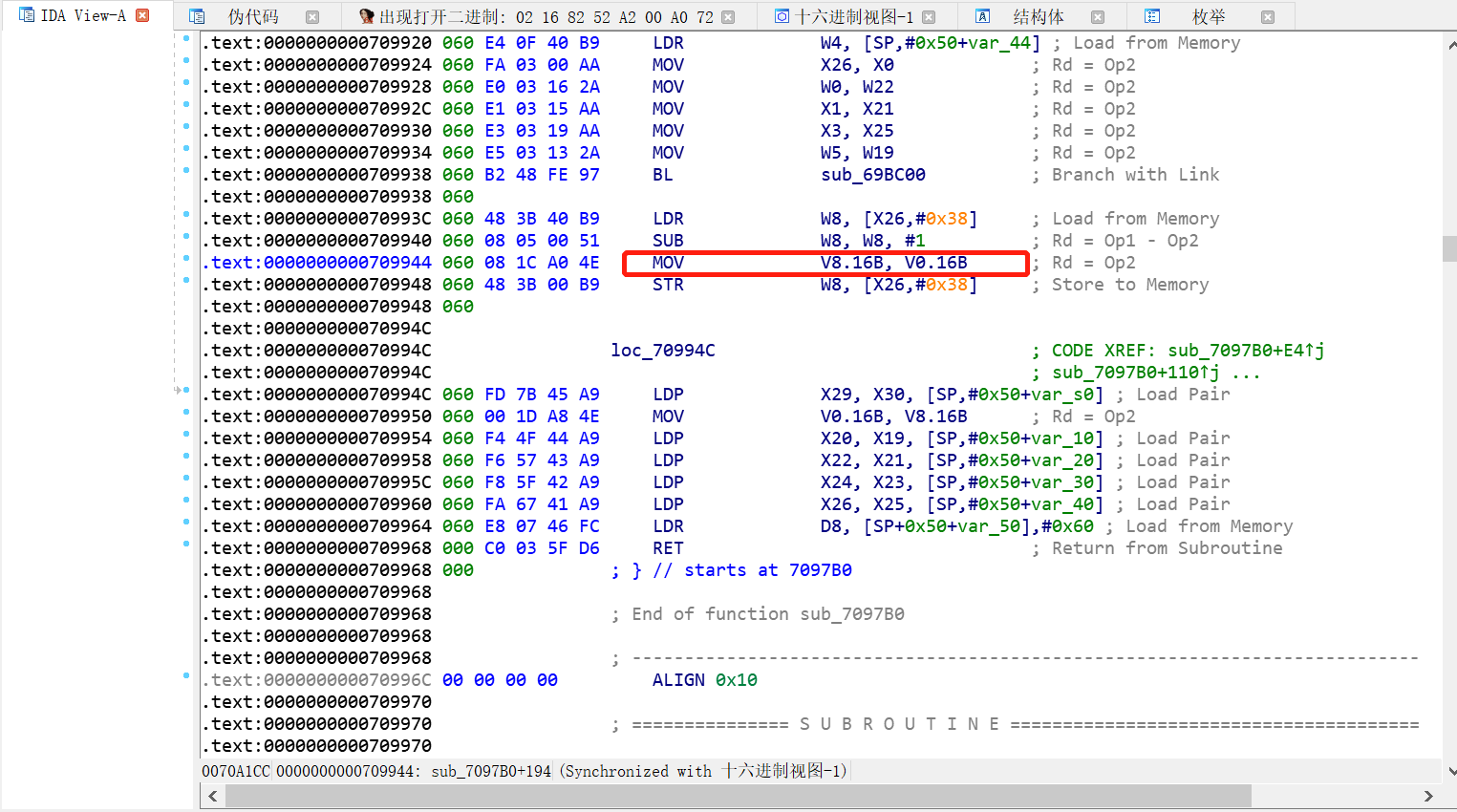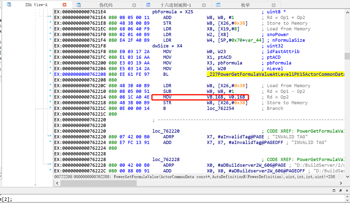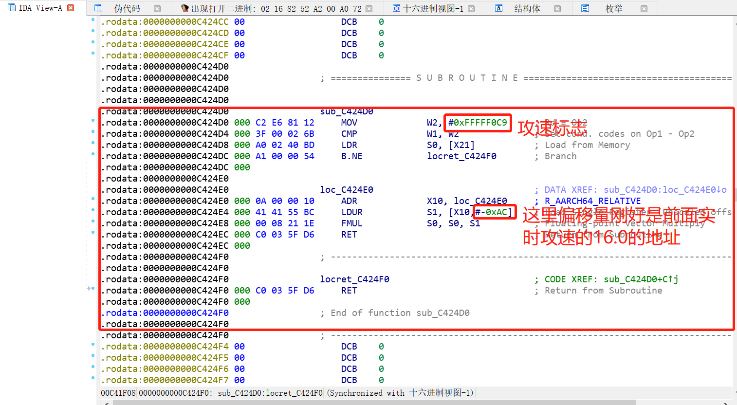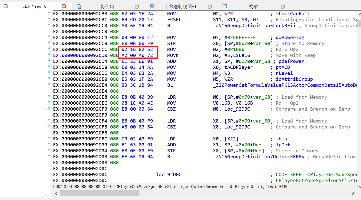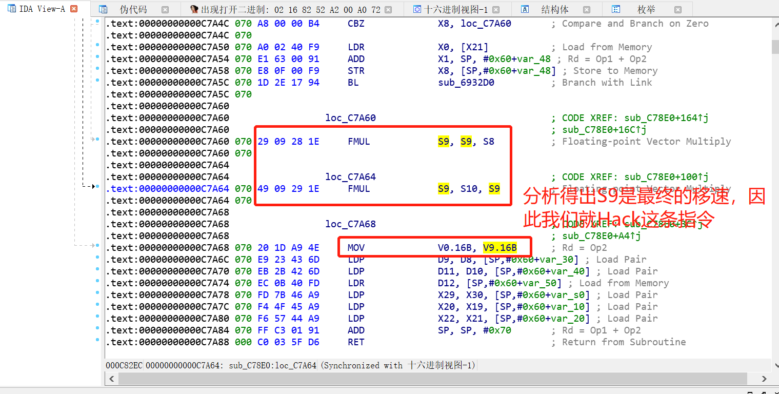 3. 拉到这段函数代码的末尾,从MOV V0.16B, V9.16B 这条指令,得知S9就是最后算得的移速,最后传给S0作为函数返回值,因此就在这条指令上加hack
