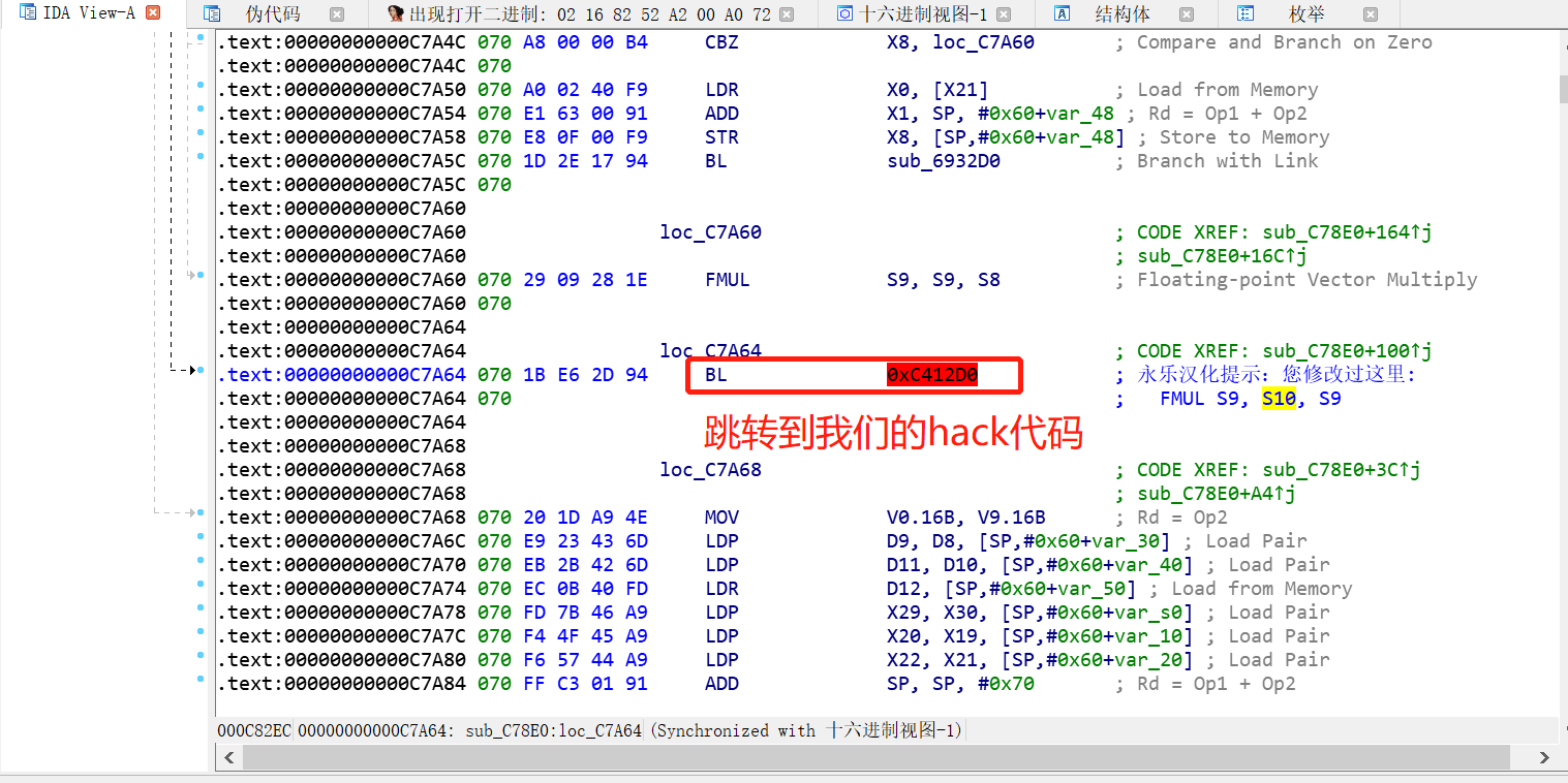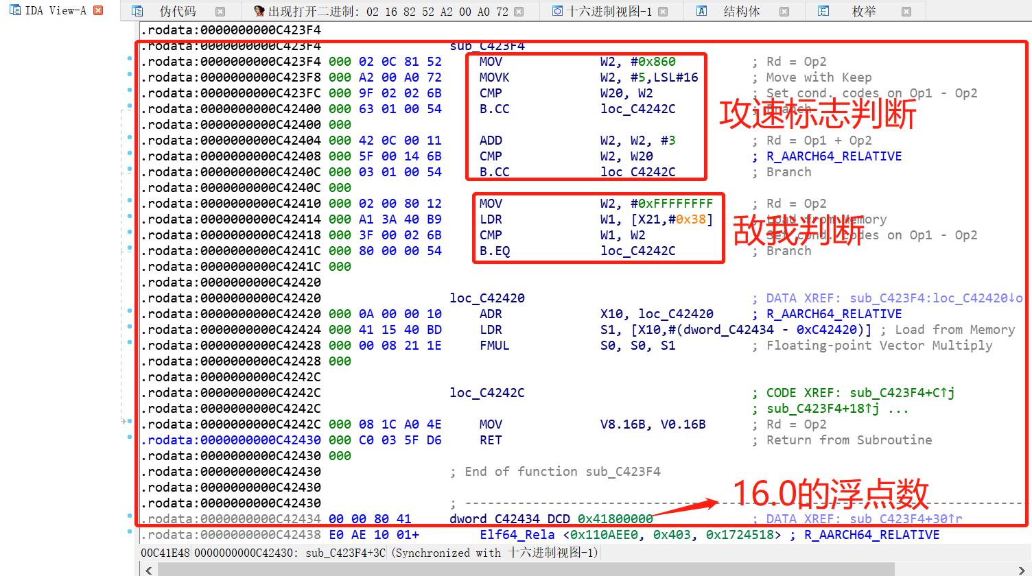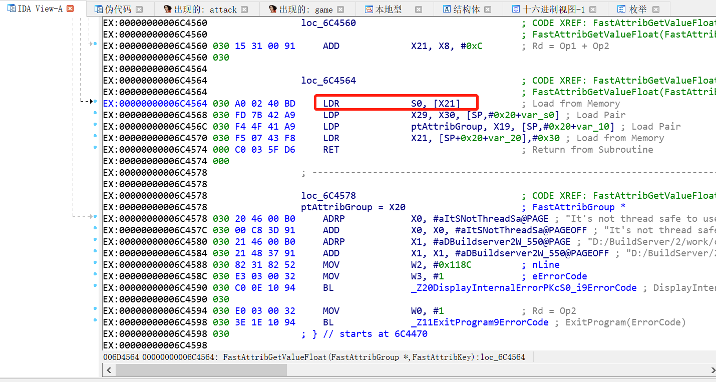 13. 这里的LDR S0,[X21]就是我们要hack的指令,我们需要把S0也乘以16倍,这样面板攻速就和我们的实际攻速对应上了,其实面板攻速可改可不改,并不影响实际攻速,不过为了完美的金手指,我们就把这里也改了,找空白区域编写代码如下