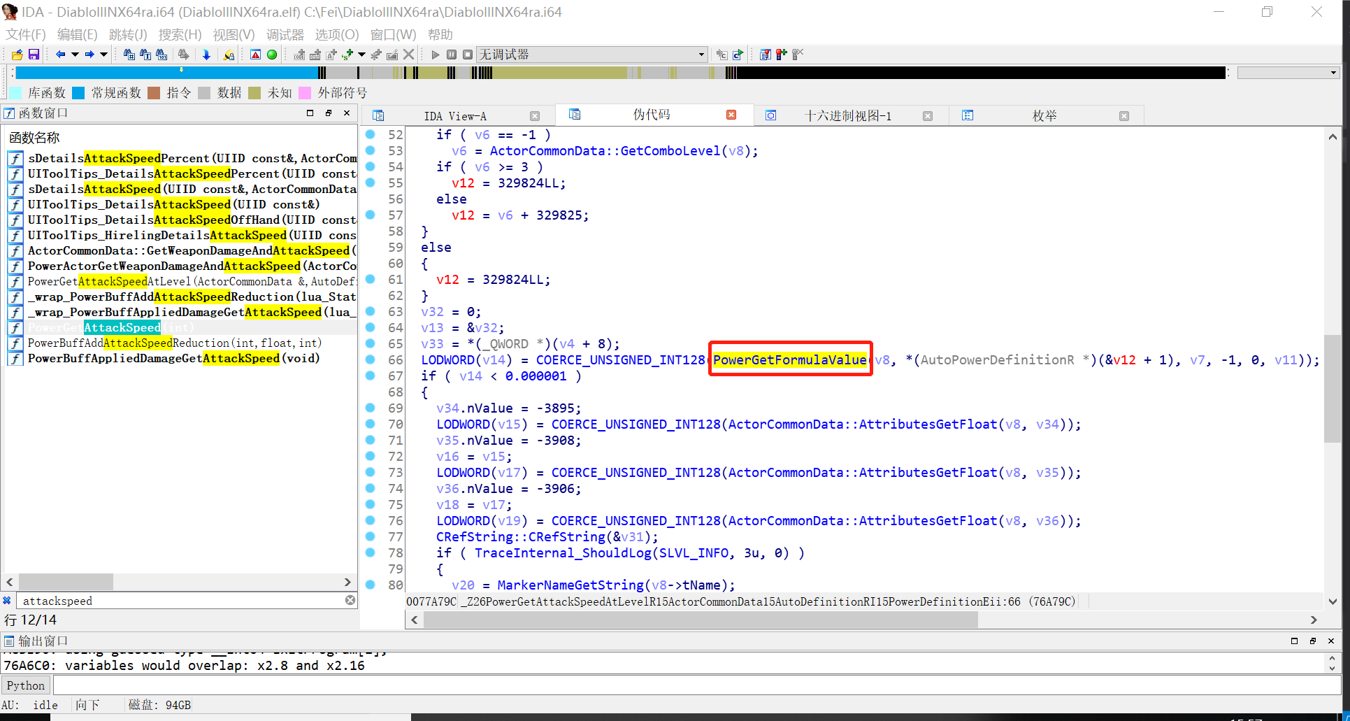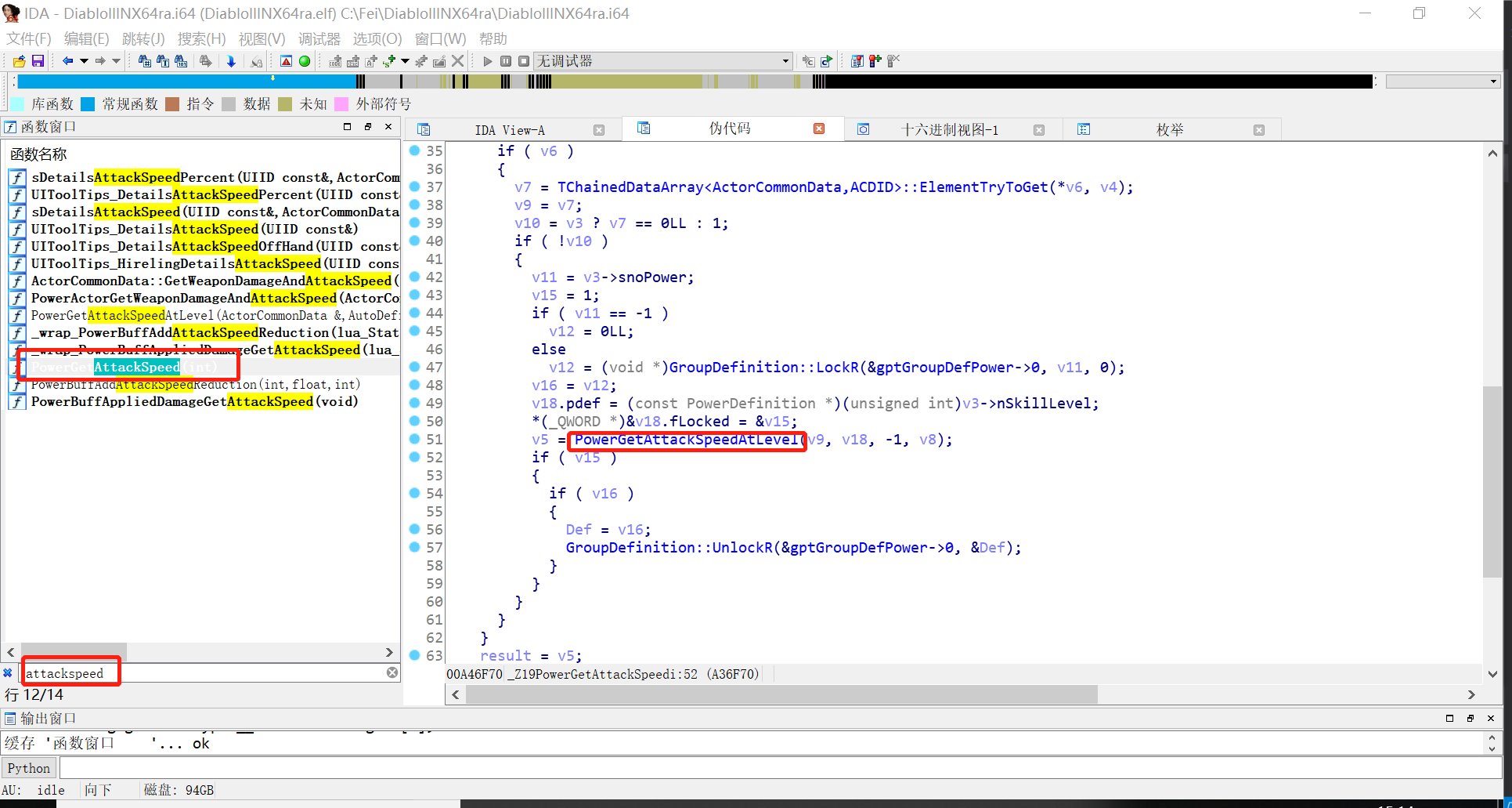 6. 测试移动速度,飞一般的感觉,至此,动态移速修改完成,接下来我们讲解动态攻速修改,这个要比移速复杂一些,原因就是攻速涉及到的功能比较多,我们搜索攻速英文attackspeed, 选择PowerGetAttackSpeed,里面再选择PowerGetAttackSpeedAtLevel,如果你右击这个函数选择跳转到外部应用,会发现计算动画的速度也会调用这个函数,说明我找的函数就是攻速获取函数