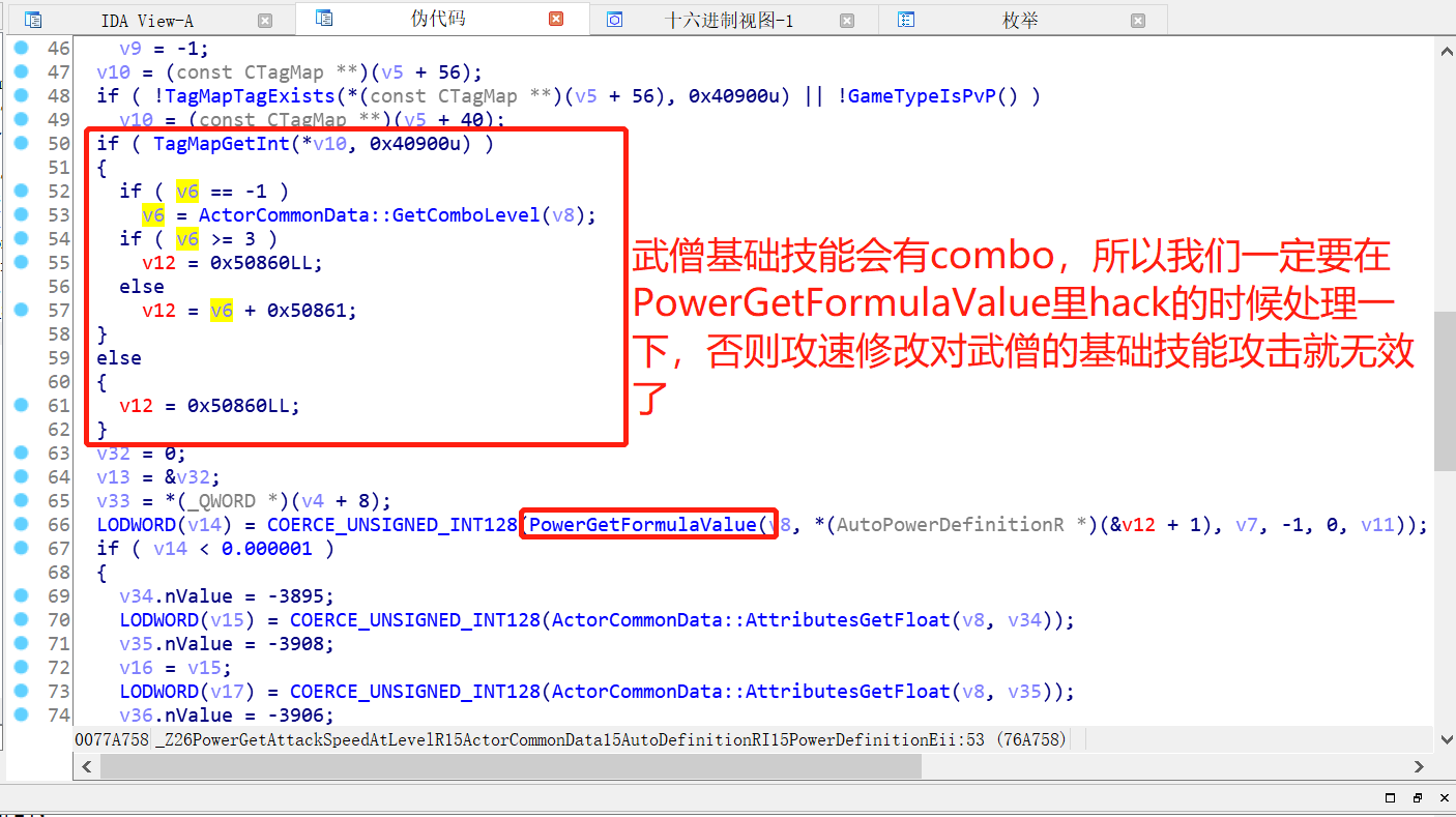 9. 别着急,先看下这段伪代码,我之前在测试的时候发现只有武僧的基础技能攻速不生效,后来才发现了combo攻速和普通攻速的某个参数值不一样,所以我们在hack的时候不但要判断攻速标志参数是否等于0x50860,还要判断
