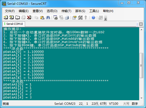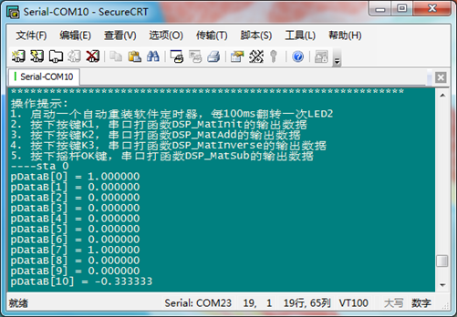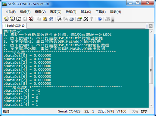 - 按下按键K1,串口打函数DSP_MatInit的输出数据。