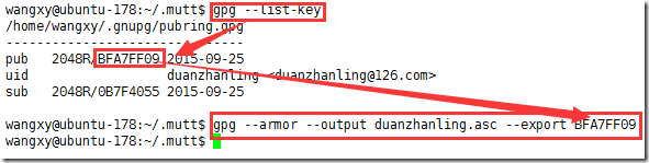 gpg -a -o duanzhanling.asc --export BFA7FF09