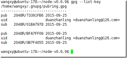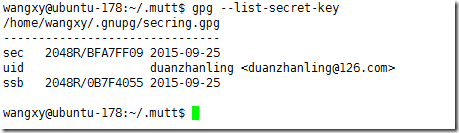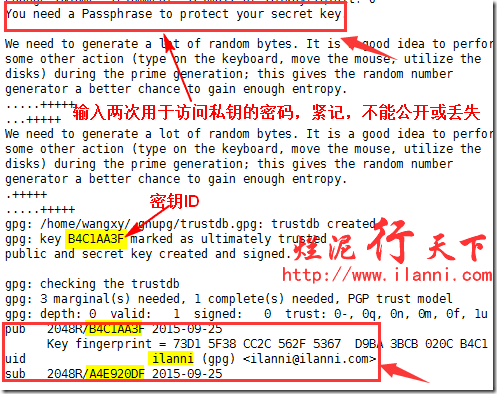 上图中,有两个地方需要记住。第一就是设置的私钥密码,第二就是生成密钥的密钥ID。