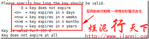上面这张图中,我们根据实际情况进行选择密钥的有效期限。在此默认使用永久生效,永不过期。