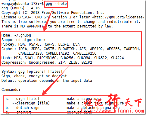 gpg安装完毕后,我们可以使用gpg --help命令查看gpg的使用方法。如下: