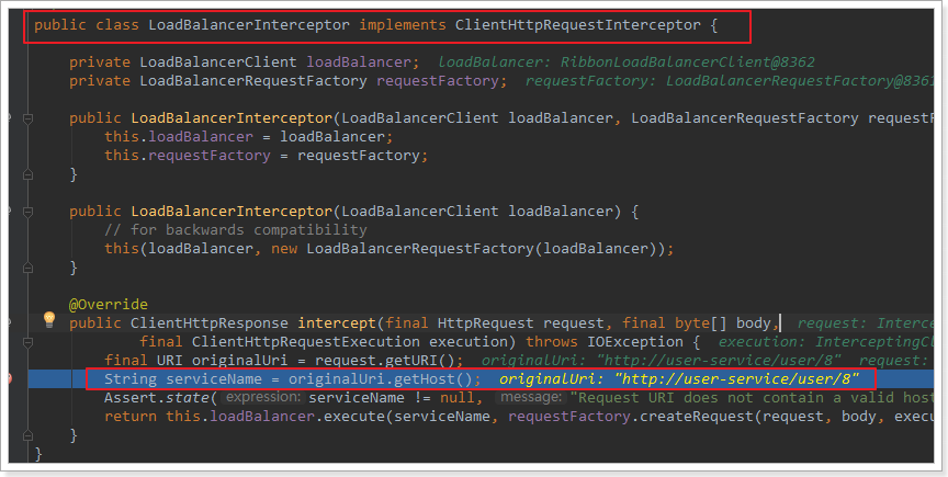 显然有人帮我们根据service名称,获取到了服务实例的ip和端口。它就是LoadBalancerInterceptor