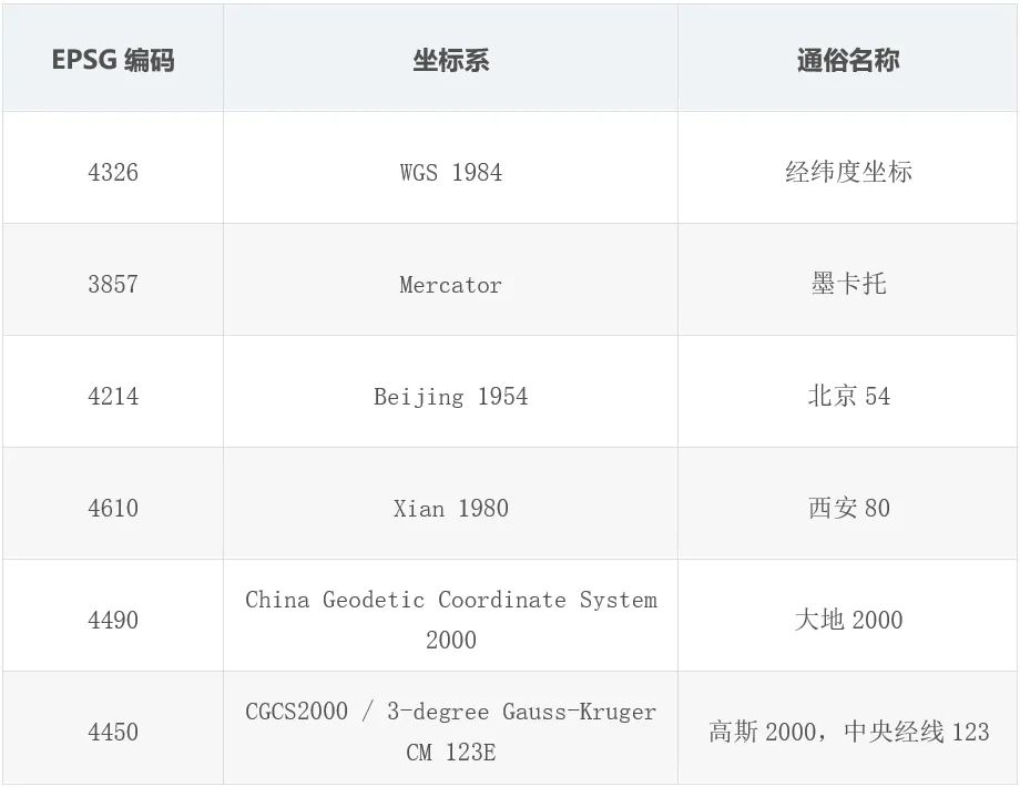上面已经说到EPSG负责全球的坐标系统,那么我们常见的这些坐标系对应的EPSG编码是什么呢,可以参照下面的表格。